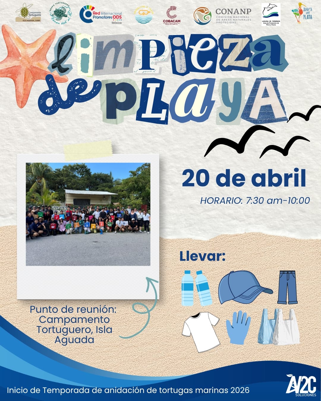 En el marco del inicio de la temporada de anidación de tortugas marinas 2026, te invitamos a sumarte a la jornada de limpieza de playa en el Campamento Tortuguero de Isla Aguada. Esta actividad busca proteger el hábitat de especies marinas y promover la participación ciudadana en el cuidado de nuestros ecosistemas costeros.